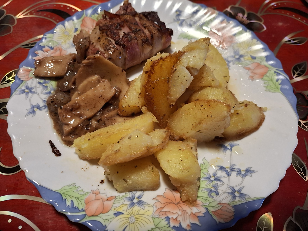 Na tanjir prvo stavite rolovani file, pored njega prilog-pečeni krompir ili grilovano povrće po svom izboru.